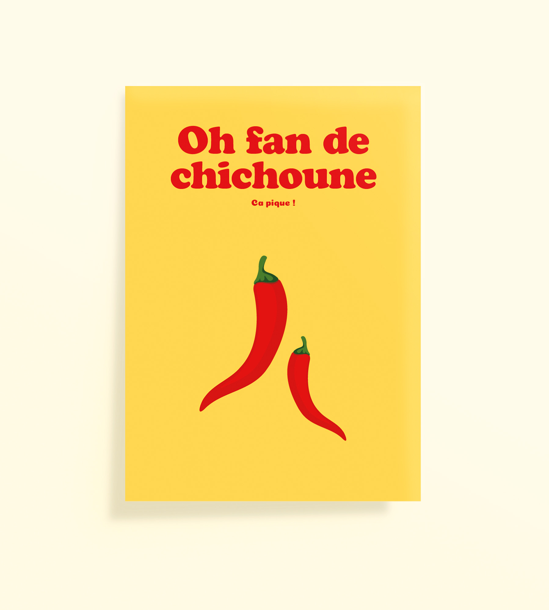 Le contraste entre le jaune lumineux et les piments rouges crée une ambiance chaleureuse, drôle et pleine de vie.