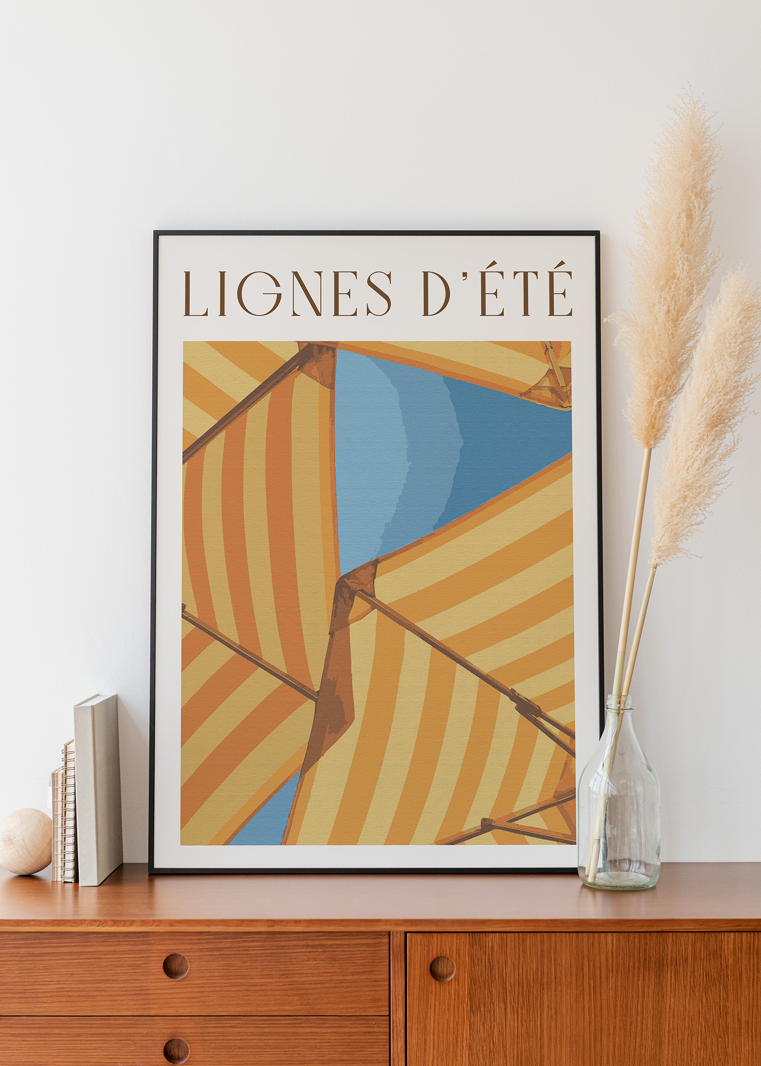 Crée un véritable mur solaire en associant cette affiche parasol jaune avec d’autres modèles de la Collection Sud. L’association de plusieurs affiches aux tons méditerranéens apporte une identité forte et une atmosphère joyeuse qui respire l’été toute l’année 🌞.